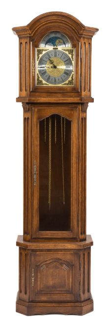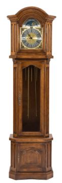 Richard Broad, Bodmin, a modern longcase clock: the eight-day duration movement striking the hours on a bell, the break-arch brass dial with black Roman numerals, a moonphase disc to the arch and signed Richard Broad, Bodmin, Cornwall, the mahogany case with canted corners, a glazed trunk door and a break-arch top, height 215cm