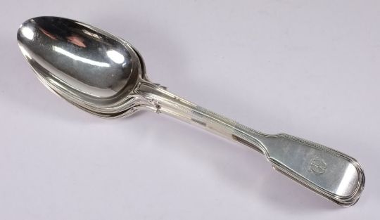 A set of six Victorian silver fiddle and thread pattern tablespoons, maker Joseph & Albert Savory, London, 1849: initialled, 21.5cm, 15.92oz.