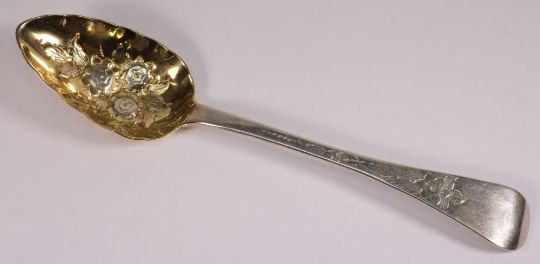 A George IV and later decorated berry spoon, maker Joshua Buckton, Dublin 1825: the gilded bowl with embossed floral decoration and having foliate chased decoration to the stem, 25cm long, 2.26oz.