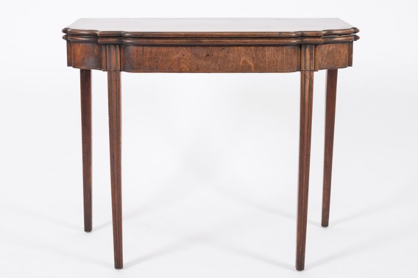 A George III mahogany tea table:, of shaped front outline, the hinged top with a moulded edge, having a boxwood strung frieze, on fluted square tapered legs, 91cm (2ft 11 3/4in) wide.