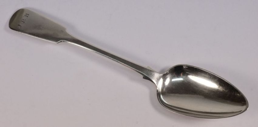 A 19th century Jersey silver fiddle pattern tablespoon, maker Charles William Quesnel, circa 1820: initialled, 22.5cm long, 1.84oz.