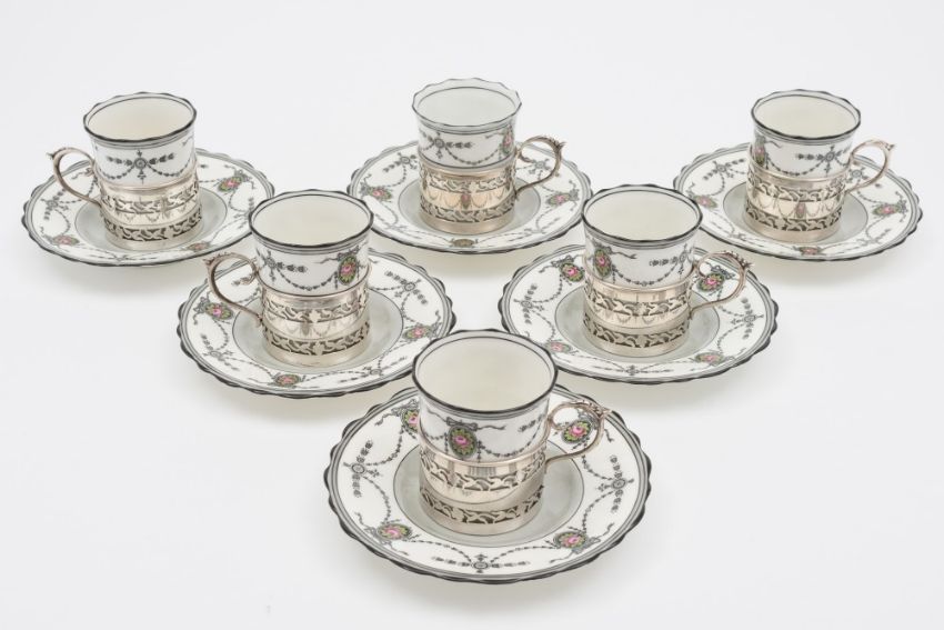 WITHDRAWN FROM SALE An Aynsley bone china six piece coffee service, with silver mounts to the coffee cans, Birmingham, 1922: having printed garland and flowerhead decoration.