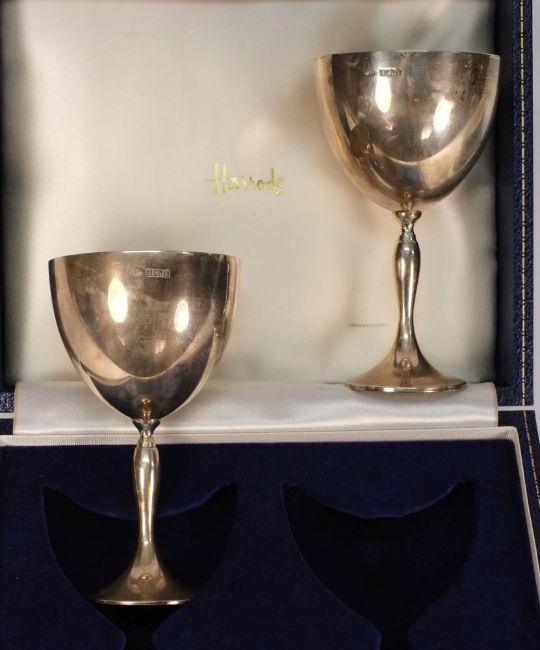 A pair of Elizabeth II silver wine goblets, maker Turner and Simpson, Birmingham, 1971: the plain bowl with gilded interior and slender tapering stem, circular spreading foot. 13cm high. 10.38 ozs, contained in a fitted Harrods case.