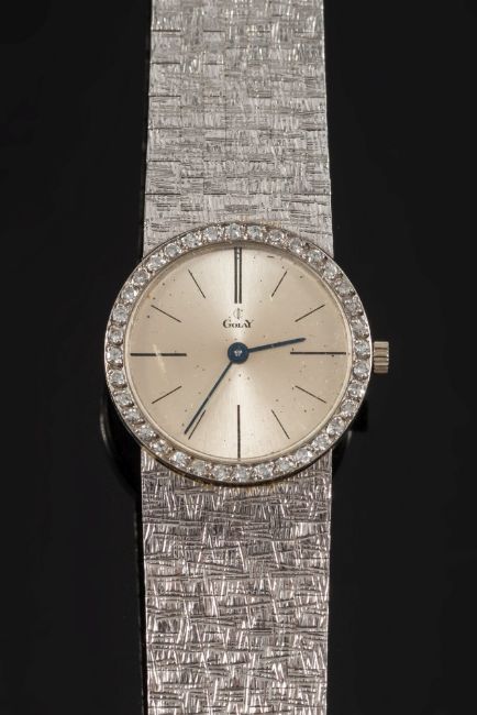 A lady's diamond mounted 'Golay' wristwatch:, the satin-finish circular dial 20mm diameter with baton markers surrounded by small, circular diamonds in an 18ct white gold case with integral mesh-link bracelet.