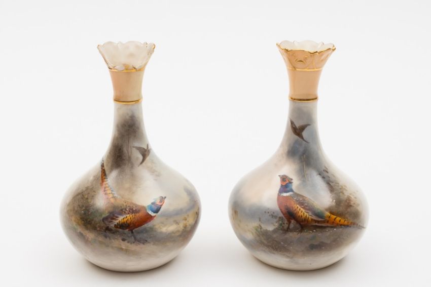 A pair of Royal Worcester porcelain vases by James Stinton: of tear drop form each enamelled with a cock pheasant in a landscape, green backstamp and datecodes for 1904 and 1905 with model no. 702/G, signed lower left Jas Stinton, 13 cm high, [significant loss to one rim].