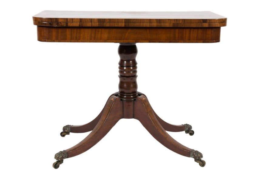 A Regency mahogany, rosewood crossbanded and inlaid card table:, bordered with boxwood lines, the rectangular baize lined hinged top with rounded corners and an outer satinwood banding, on turned central column and quadruped splayed legs, terminating in brass lion's claw cappings and castors, 91cm (2ft 11 3/4in) wide.