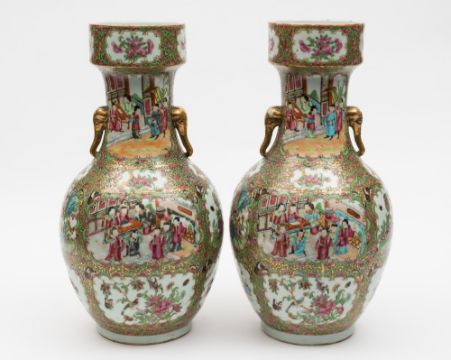 A pair of Canton porcelain vases: of oviform with raised and pan topped necks and elephant mask handles enamelled in the typical palette front and verso with multiple panels containing figures, birds, blooms and butterflies reserved on a profuse and gilt embellished ground, 45 cm high, 19th century.