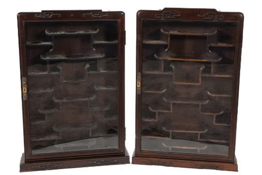 A pair of Chinese hardwood wall mounted display cabinets:, of rectangular shape and small size, having shaped and tiered shelves, each enclosed by a glazed panel door, within fret decorated surrounds, 46cm (1ft 6in) wide, 72cm (2ft 4 1/2in) high.