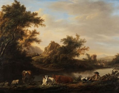 Johannes Jansen [1729-1784, Dutch School]- An upland river landscape, cattle and sheep with a figure resting in the foreground, mountains beyond:- signed and dated 1767 bottom right oil on panel 43.5 x 55.5cm