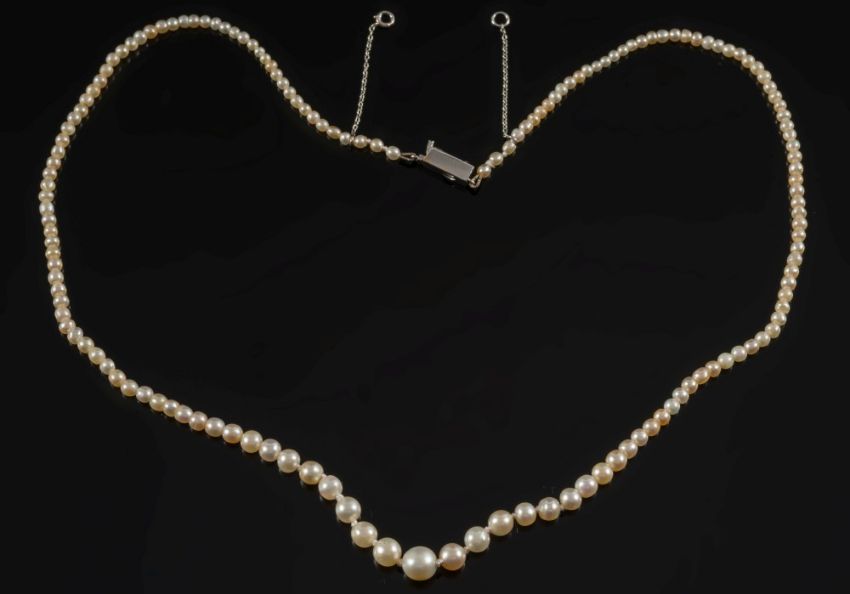 A pearl and seed-pearl single string necklace: with ruby and diamond clasp, the pearls and seed-pearls graduated from 2.7mm to 6.6mm diameter, secured to a ruby and rose diamond mounted three-stone clasp. (Pearls untested).