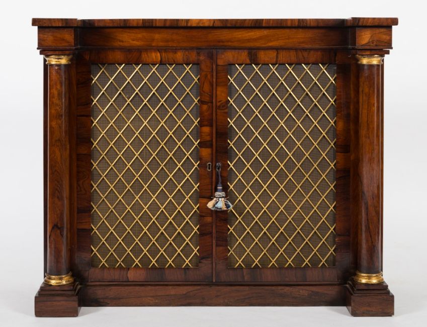 A Regency rosewood dwarf side cabinet:, of recessed breakfront outline, fitted with interior shelves, enclosed by a pair of brass lattice panel doors, flanked by turned gilt mounted columns, on a plinth base, 105.5cm (3ft 5 1/2in) wide, 87cm (2ft 10 1/4in) high.
