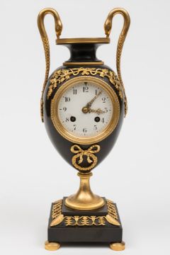 A French bronze and ormolu mantel clock: the eight-day duration movement striking the hours and half-hours on a bell with the backplate bearing the name of the retailer Maple and Co Ltd, Paris along with the trademark of the clockmaker Samuel Marti showing the award of the Medaille d'Argent in 1889, with the serial number 1967, the white enamel dial with black Arabic numerals, fast/slow regulation above XII o'clock and fretted and engraved brass hands, the urn shaped bronze case with gilt-brass ormolu mounts, feet, bezel and swan neck handles, height 38cm. * Biography Maple & Co. were well known maker's and retailers of furniture from the Victorian period and produced many fine pieces including clocks, often using the movements made by the well-known Parisian clockmakers Samuel Marti et Cie.