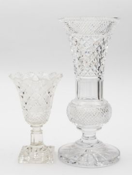 A cut glass celery vase and a cut glass vase: the former of flaring form, the rim with fan cut panels, above a broad band of fret cut diamond panels and a hobnail band set on a facet cut stem on square base, 21 cm high, the latter of thistle shaped form with diamond and slice cut decoration, 35.5 cm high.