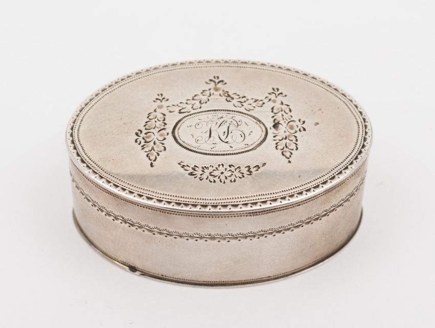A George III silver nutmeg grater, maker Thomas Phipps & Edward Robinson II, London 1797: initialled, of oval outline, the hinged lid enclosing a steel grater, having a hinged base lid, 4.5cm. long, 1.28ozs.