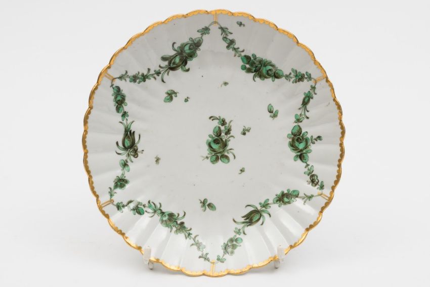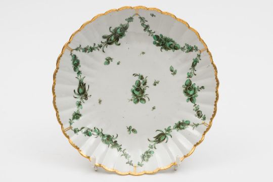 A Richard Champion (Bristol) dish: of circular fluted form, painted in green camaieu with floral sprays and festoons hung from gilt rings, circa 1775, 21 cm diameter.