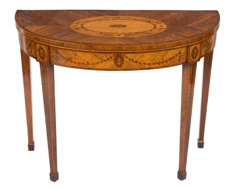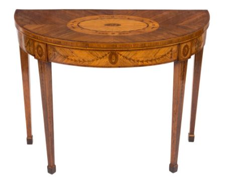 A late 18th Century Dutch Gonzalo Alves and marquetry inlaid card table:, of D shaped outline, crossbanded and bordered with boxwood and ebony lines, the baize lined hinged top with a central oval wrythen fan medallion within a satinwood band with flowerheads and husks, the quarter veneered apron decorated with paterae and swags of husks, on square tapered legs with pendant husk ornament, terminating in spade feet, 94cm (3ft 1in) across.