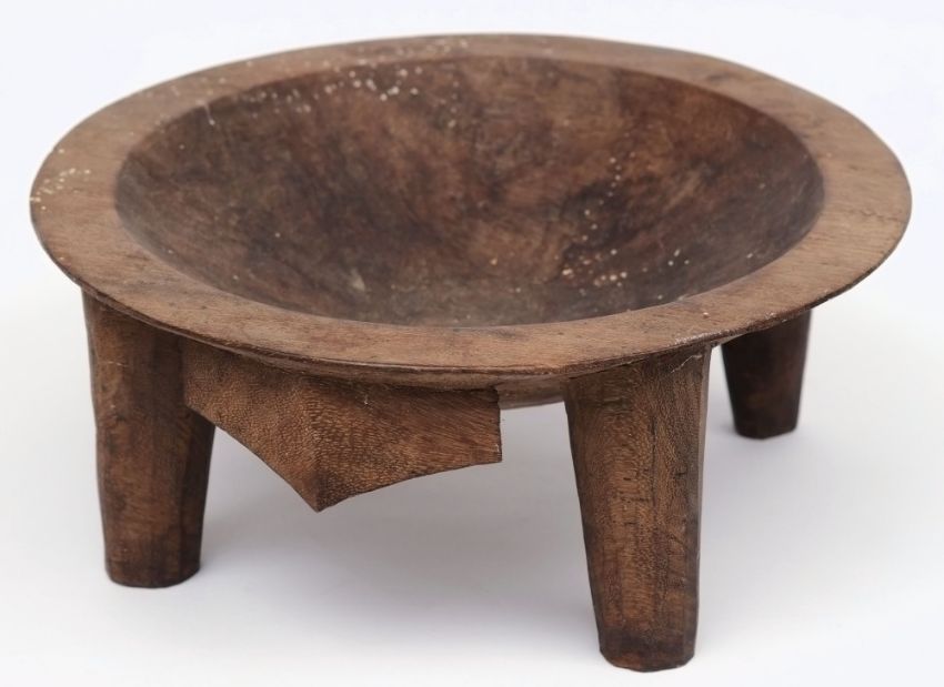 A Fijian hardwood carved bowl: of circular form raised on four peg feet, 31cm. diameter