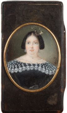 German School mid 19th Century- A tortoiseshell and horn snuff box, the lid inset with a miniature portrait of a lady, bust-length, with long dark hair plaited and tied high, wearing drop earrings and a black dress with lace collar:- indistinctly signed bottom right, on ivory, oval miniature 5.3cm, the box 9.5cm.