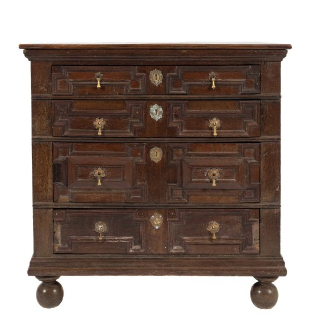 A 17th Century and later oak rectangular chest:, containing four long geometric moulded panel drawers, on later ball shaped feet, 90cm (2ft 11 1/2in) wide.