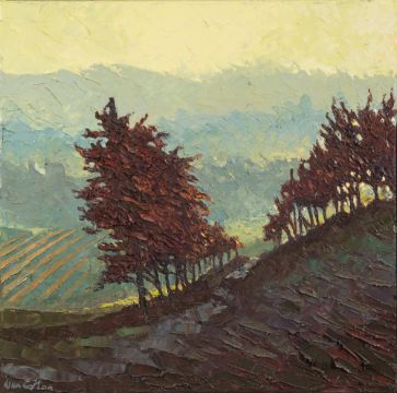 * Alan Cotton [b.1936]- Piemonte - Burnished Vines in Hazy Light:- signed bottom left oil on canvas 50.5 x 50.5cm.