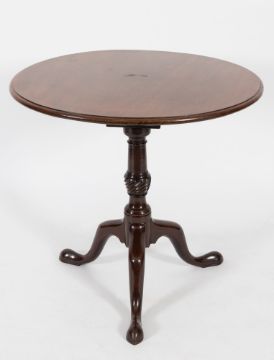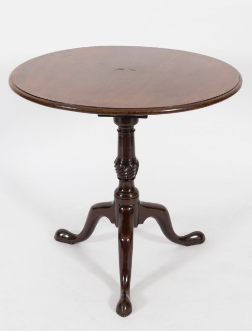 A mid 18th Century mahogany circular tea table:, the snap top with a moulded edge on ring turned and spirally fluted vase knopped column, headed with a bird cage and tripod splayed legs, terminating in pointed pad feet, 75.5cm (2ft 5 3/4in) diameter.
