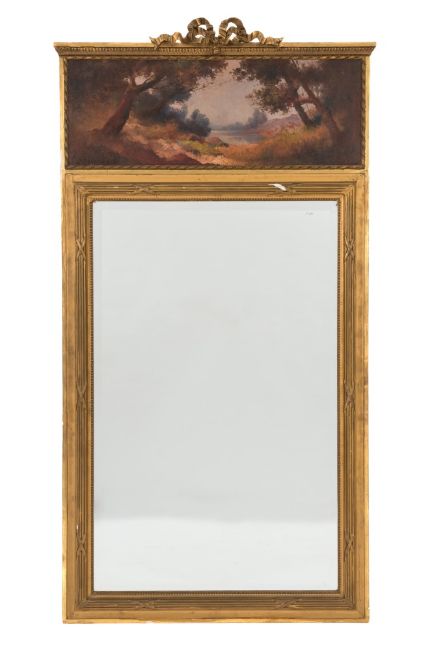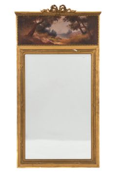 A French giltwood and decorated pier mirror:, with ribbon tied cresting and a foliate moulded cornice, having a painted frieze panel with wooded lake scene signed P Crazzous Fils and dated 1925, the rectangular inset bevelled plate within a beaded border and reeded and ribbon decorated and fielded surround, 173cm (5ft 8in) x 91.5cm (3ft).