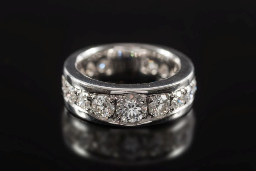 Larry. A diamond mounted eternity ring: pave-set with graduated circular brilliant-cut diamonds estimated to weigh a total of 2.0cts in a wide band ring, stamped 'PT950 LARRY A', ring size Q, 13.2gms.