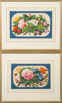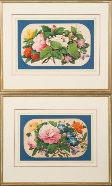 A set of four Chinese botanical drawings on rice paper: each painted with a large bouquet of flowers and foliage, mid 19th century, 15 x 24 cm [minor damage and staining].