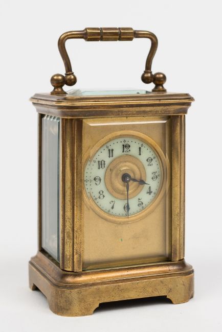 A miniature French Victorian carriage clock: the eight-day duration timepiece movement having a platform cylinder escapement, the ivorine chapter ring with stylised Arabic hour numerals, blued steel spade hands and a matt gilt mask, the miniature Corniche case with handle to the top, height 8cm (handle down), 9.5cm (handle up)