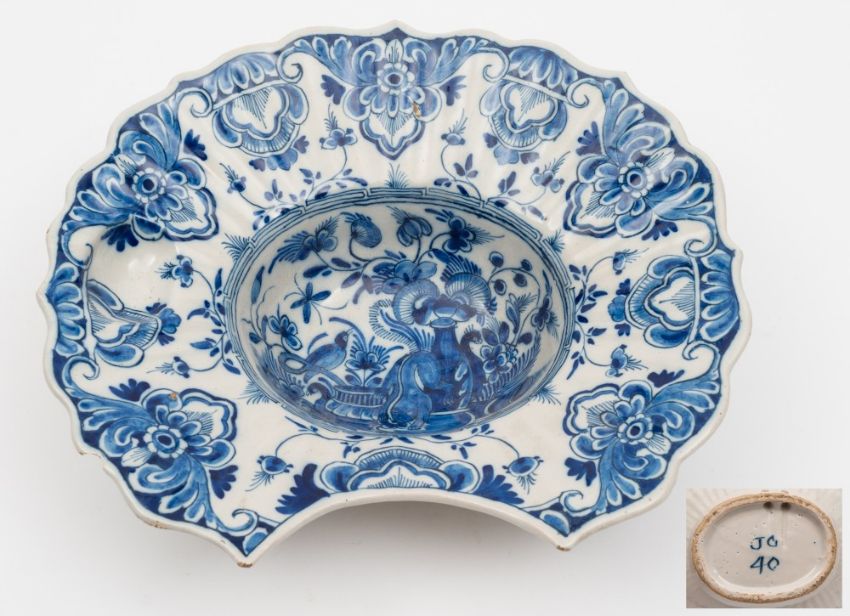 A Dutch delft barber's bowl: of fluted 'helmet' form, the ribbed border with small well, painted in blue with a squirrel, birds and a vase of flowers with a foliate scroll and lappet border, painted J.G. 40, possibly for Johannes Gal, 18th century, 27 cm wide.
