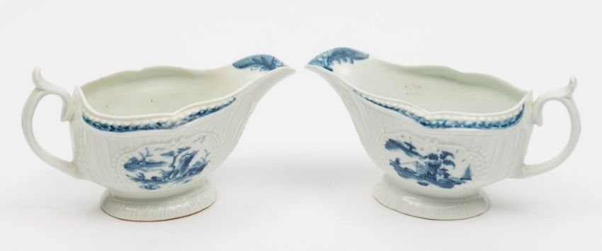 A pair of Worcester First Period porcelain sauceboats: of press moulded form with panelled fluted exteriors painted in blue in the Little Fisherman pattern below a foliate and diaper border pattern, the interior with a floral spray, open crescent marks, circa 1765, 16 cm long, [some bleed on one border].