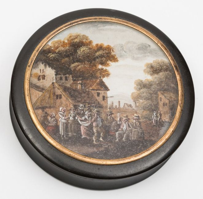 A 19th century tortoiseshell circular box and cover: the cover painted with figures in a continental wooded village, 8.25cm. diameter.