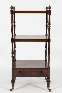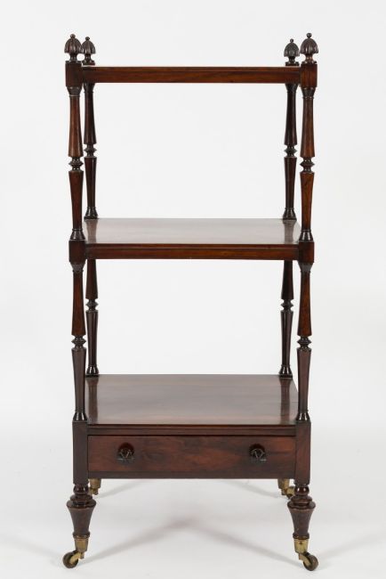 An early 19th Century rosewood three tier whatnot:, with reeded finials, the rectangular tops on turned uprights, fitted with a drawer at the base, on turned tapered legs, terminating in brass cappings and castors, 48.5cm (1ft 7in) wide, 108.5cm (3ft 6 3/4in) high.