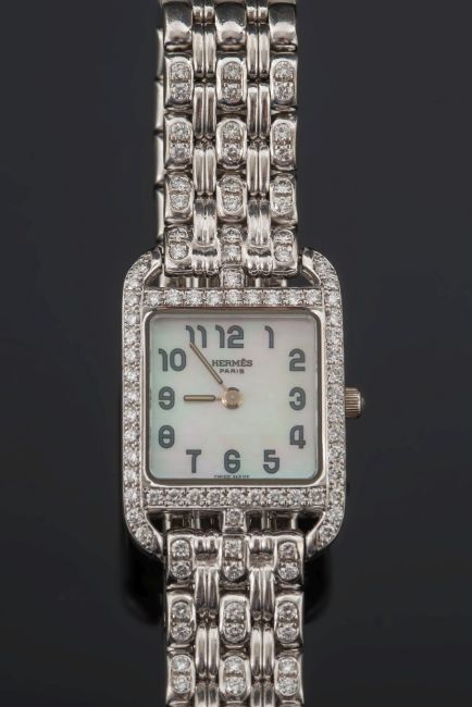 Hermes. A lady's 18ct white gold and diamond mounted 'Cape Cod' wristwatch:, the square mother of pearl dial with Arabic numerals surrounded by brilliant-cut diamonds in a case numbered 'CC1-192' and '1116434'.