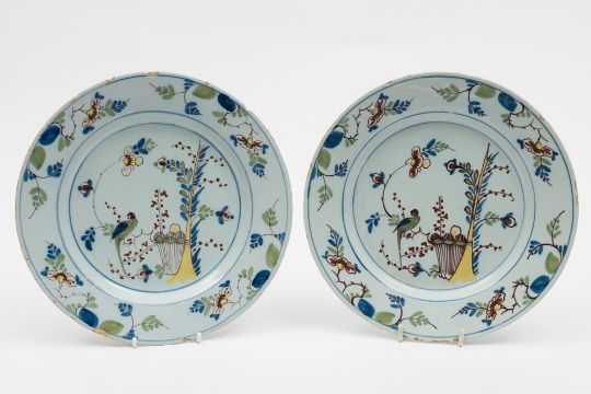 A pair of English polychrome delft plates: each painted with a long tailed bird amongst flowering plants, probably Lambeth, circa 1760-70, 23 cm diameter [rim chips].