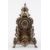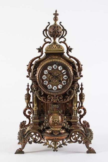 A French cast brass mantel clock: the eight-day duration movement striking the hours and half-hours on a gong, the dial with black Roman numerals to the individual enamel plaques, with decorative blued steel hands, the cast brass case having a worn copper finish with floral and c-scroll decoration, an heraldic shield to the front and surmounted by an urn of flowers, height 56cm.