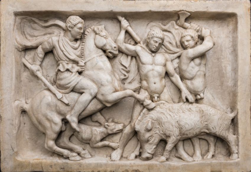 After the Antique, a large marble plaque: depicting a boar hunt, 54 x 81cm.