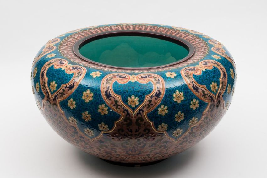 Jules Vieillard (Bordeaux) a faience 'cloisonne' bowl: of generous proportions and of squat globular form decorated in colours with carnations and peony scroll between lappet bands, impressed mark and J.V. Cie with pattern no. 264, circa 1870-90, 56 cm diameter, [cracked], with ebonised stand.