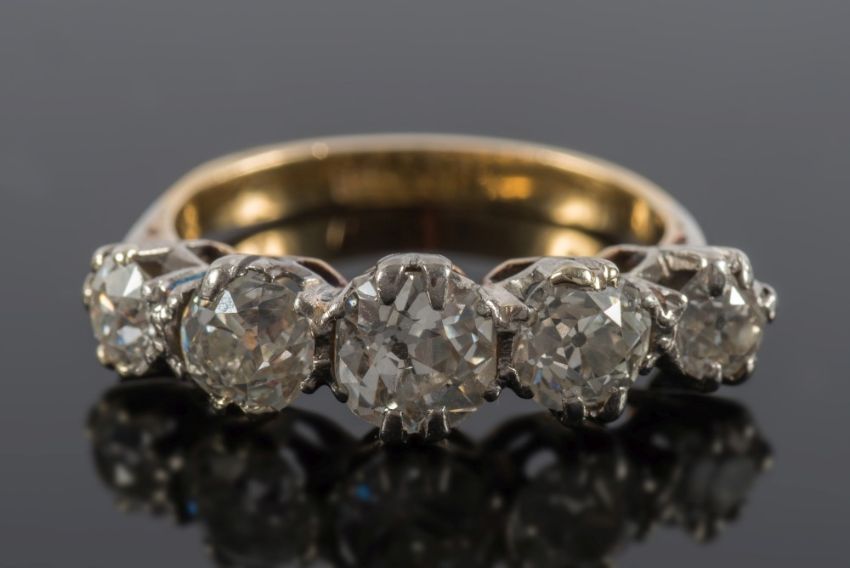 A diamond five stone ring: with graduated, old-cut diamonds approximately 0.25ct, 0.55ct, 0.80ct, 0.55ct and 0.25ct respectively, in curtain claw setting, ring size M.