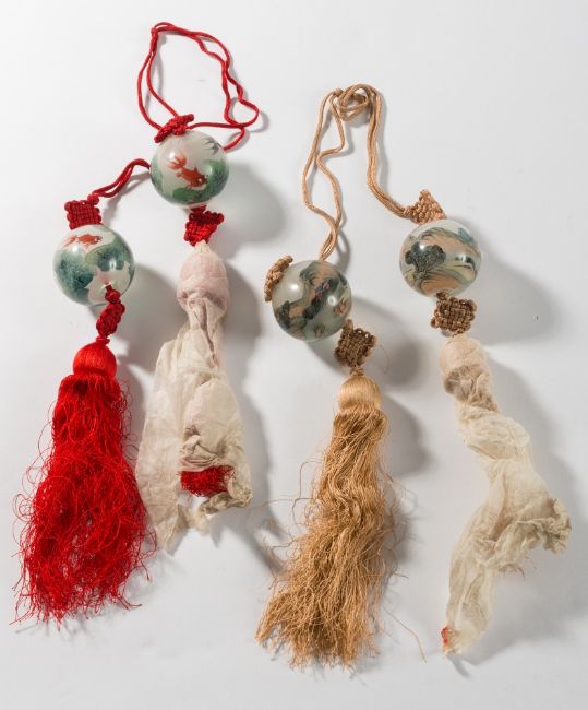 A group of four Chinese interior painted glass pendant ornaments: hung from two tasselled silk cords, one pair painted with black and red carp swimming amongst water plants, the other with lake landscapes, each 4 cm diameter. * Provenance: Mr and Mrs McAlpine Woods. - See lot 516