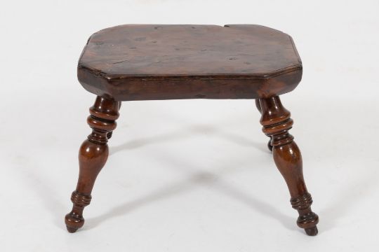 A late 18th/early 19th Century yew-wood stool:, of small size, the top with canted corners on turned and tapered splayed legs.
