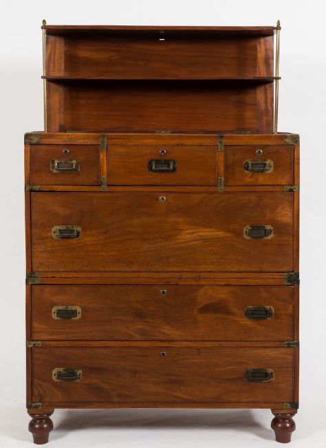 A 19th Century mahogany and brass bound campaign chest:, in two parts with folding shelved superstructure on brass column uprights, the upper part containing three short and a single long drawer, the lower part containing two long drawers with recessed brass handles, on short turned bun-shaped tapered feet, 99cm (3ft 3in) wide.