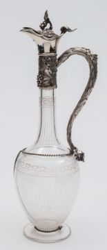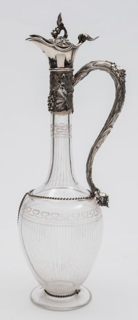 A Victorian silver mounted claret jug, maker George Richards & Edward Brown, London, 1861: of ovoid form with slender neck, having a hinged lid with grape and vine leaf finial, with similar decoration to the neck and handle, 37cm. high.