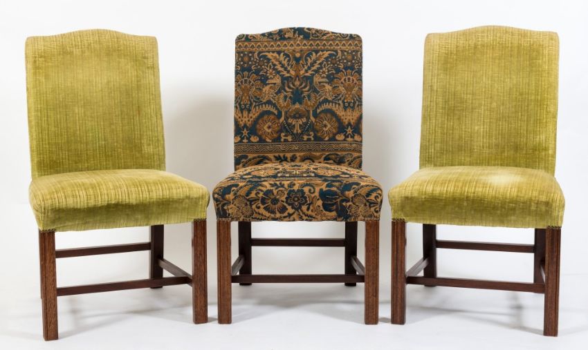 A set of six mahogany and upholstered side chairs in the Georgian taste:, with arched stuff over backs and seats on moulded square chamfered legs, united by stretchers (five upholstered in green moquette material, one in blue patterned tapestry).