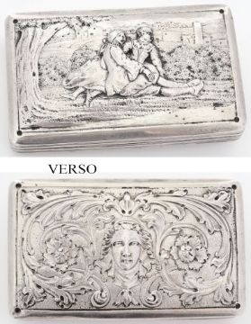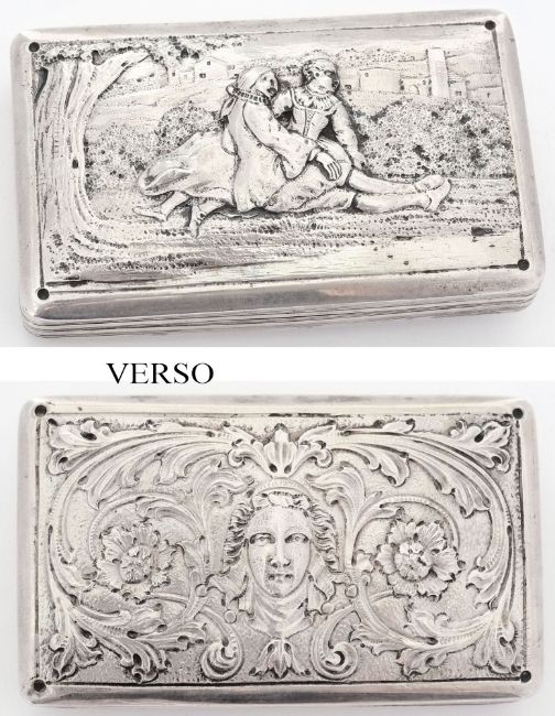 A 19th century Continental silver snuff box: of rectangular outline, the lid decorated with figures of lovers seated under a tree with village beyond, the underside decorated with female mask and foliate scrolls, with gilded interior, 11cm. wide, 4.53ozs.