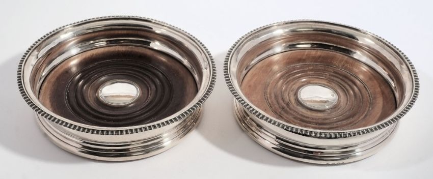 A pair of George III silver wine coasters, maker Rebecca Emes & Edward Barnard I, London, 1812: of circular form with beaded rims and turned wood bases, 15cm. diameter.