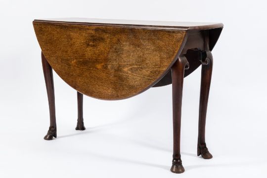 A George II mahogany oval drop flap dining table:, with a hinged top on scroll decorated cabriole legs, terminating in hoof feet, the top 110.5cm (3ft 7 1/2in) x 109cm (3ft 7in) extended.