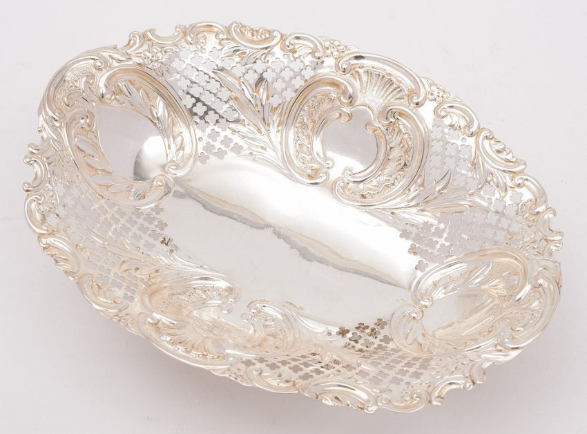 A Victorian silver bon bon dish, maker Edward Hutton, London, 1892: of oval outline, with pierced and foliate and scroll embossed decoration, raised on four swept feet, 22.5cm. wide, 7.51ozs.