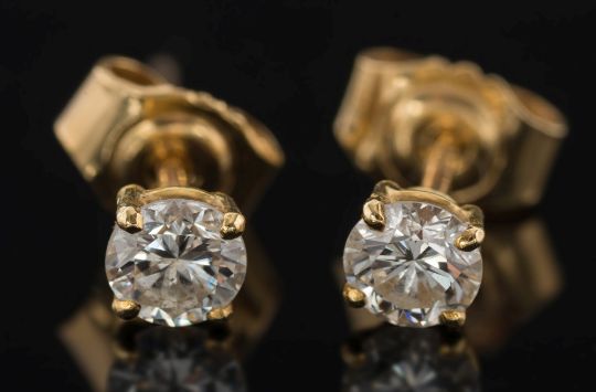 A pair of diamond single stone ear studs: each with a circular, brilliant-cut diamond in 18ct yellow gold, four claw setting, 0.50ct total diamond weight.
