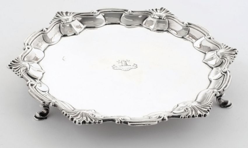A George II silver card tray, maker John Harvey I, London, 1746: crested, with shell and scroll border, raised on three swept feet, 25cm. diameter, 17.17ozs.